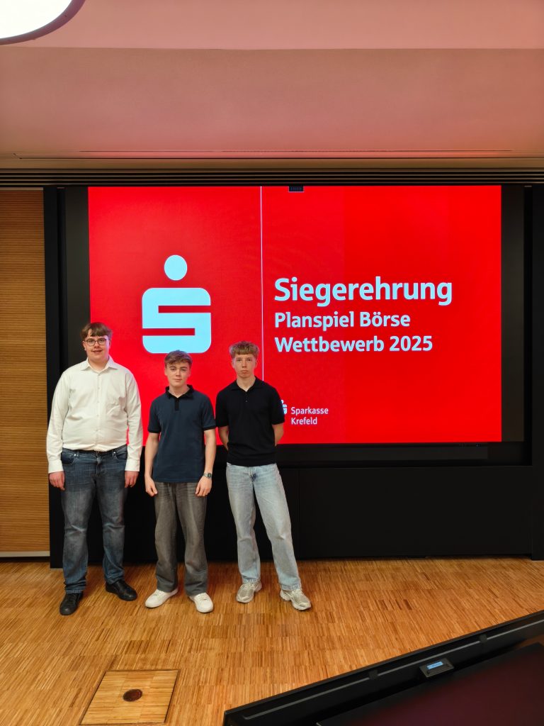 “Vom 1. Oktober 2025 bis zum 26. Januar 2026 nahm unser Team, bestehend aus Alexander Gotzen, Tim Härtl und Ruven Keller (EF), am Planspiel Börse der Sparkasse teil. In diesen vier Monaten befanden wir uns im Wettstreit mit weiteren 256 Schülerteams, die in Krefeld an den Start gingen.
